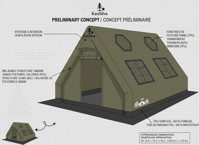 La tente Cagetown est un modèle en développement inspiré des tentes militaires canadiennes, conçu pour offrir robustesse, fiabilité et esprit d’aventure. Adaptée pour trois saisons, elle propose une structure solide et polyvalente, pensée pour accueillir un système d’air climatisé afin d’assurer un confort optimal même par temps chaud. Son identité puise à la base militaire de Gagetown au Nouveau-Brunswick, l’une des plus importantes au pays, évoquant la durabilité, la discipline et la capacité d’affronter les environnements les plus exigeants.