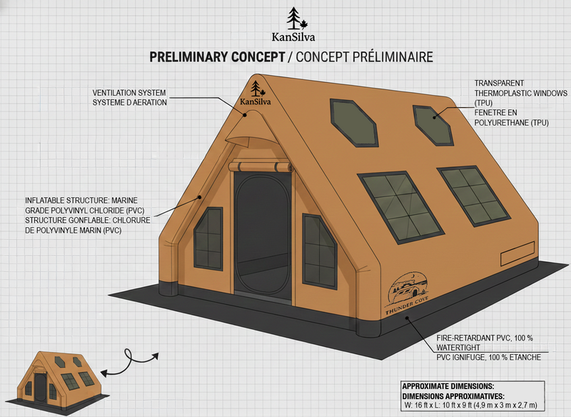 Thunder Cove est un modèle tente 3 saisons en développement inspiré des falaises ocre et des plages sculptées de Thunder Cove à l’Île-du-Prince-Édouard. Son design chaleureux reprend les teintes orangées des formations rocheuses naturelles pour créer une ambiance enveloppante tournée vers la détente et l’évasion. Conçue pour le confort, sa structure peut accueillir un système d’air climatisé afin d’offrir une expérience agréable même sous la chaleur estivale.